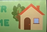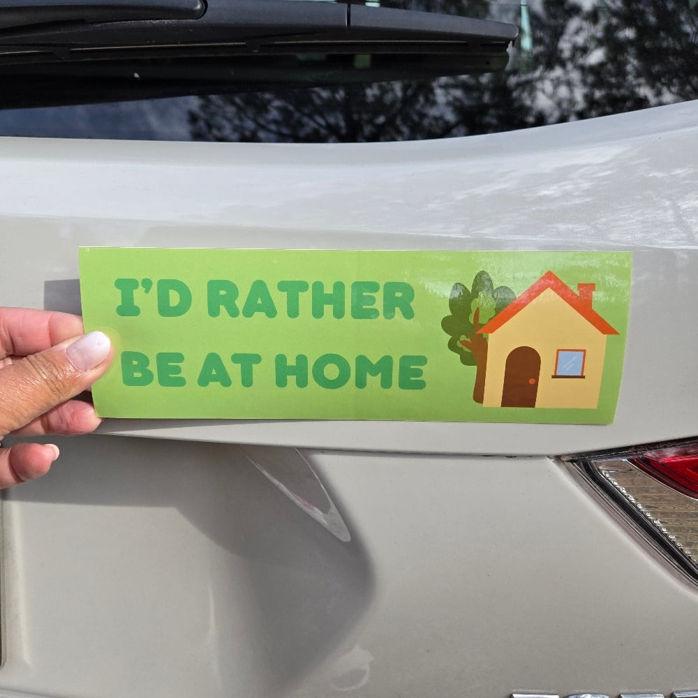 Glossy avocado green bumper sticker with graphic of house. Says " I'd rather be at home"
